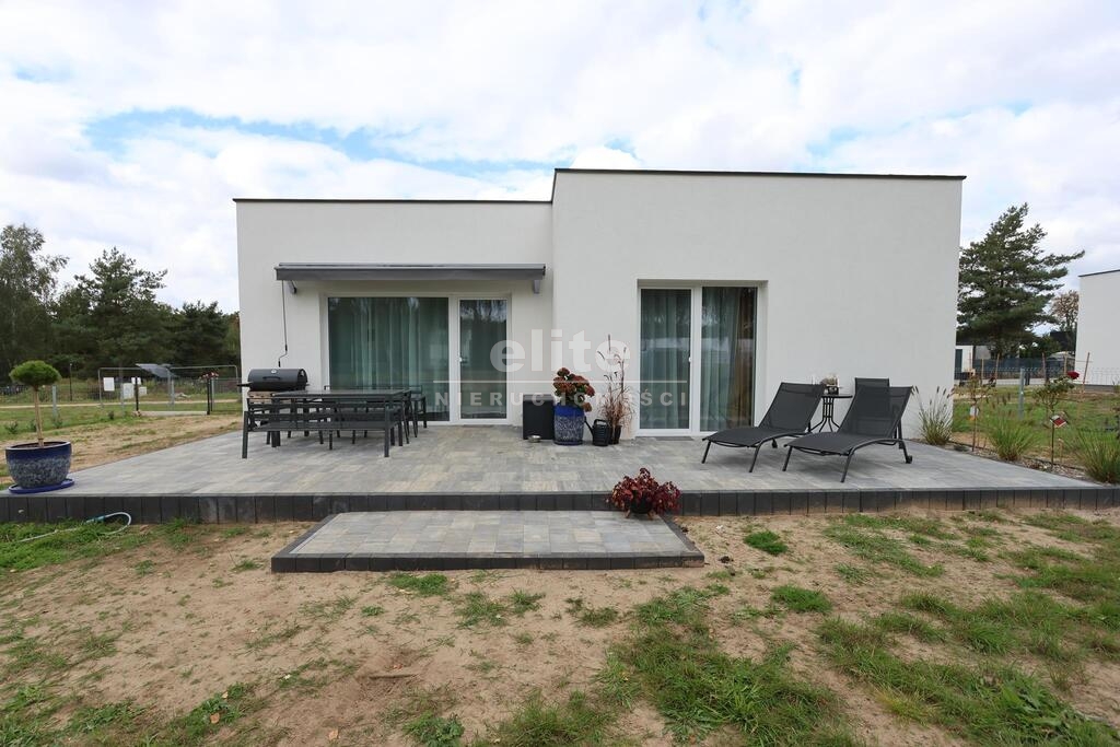 Nowy dom jednorodzinny, o nowoczesnej bryle, z płaskim dachem, wybudowany w 2024 roku, wg projektu indywidualnego.