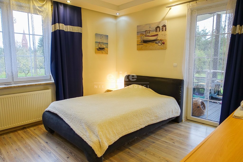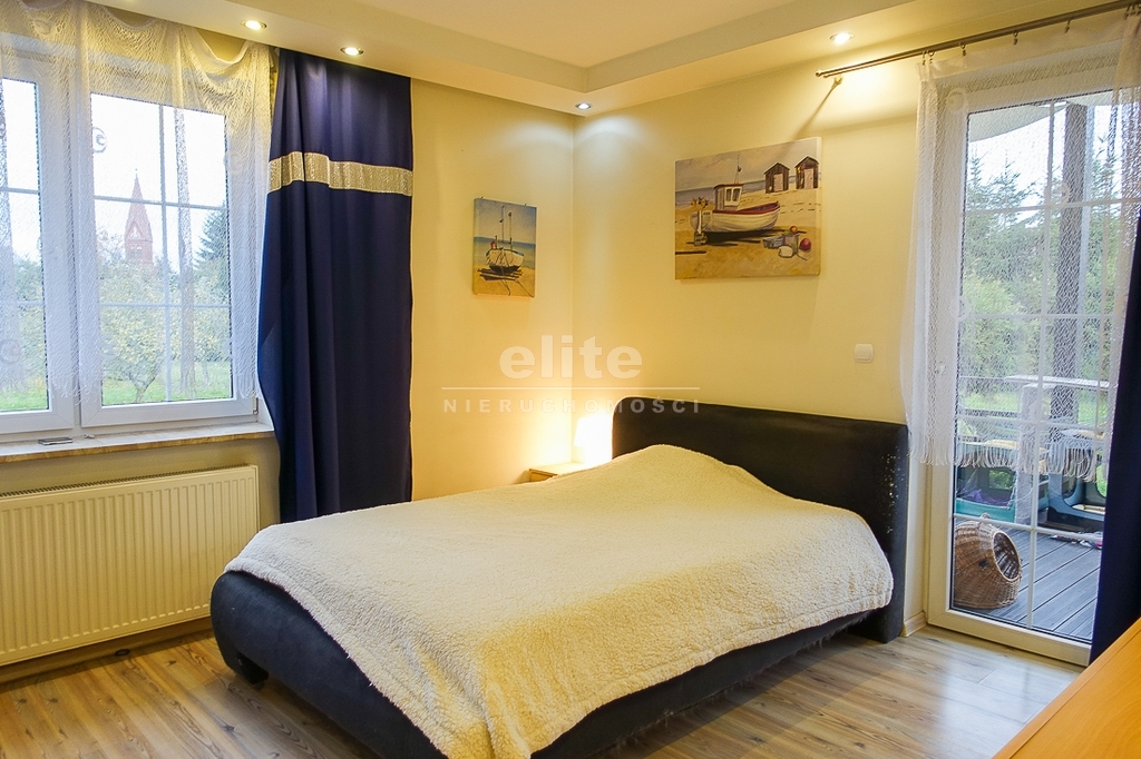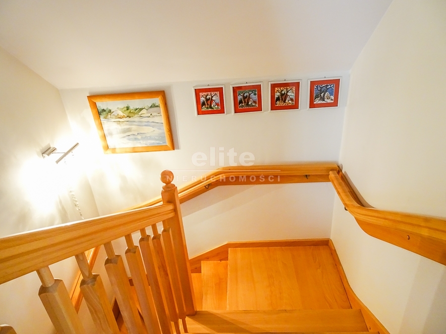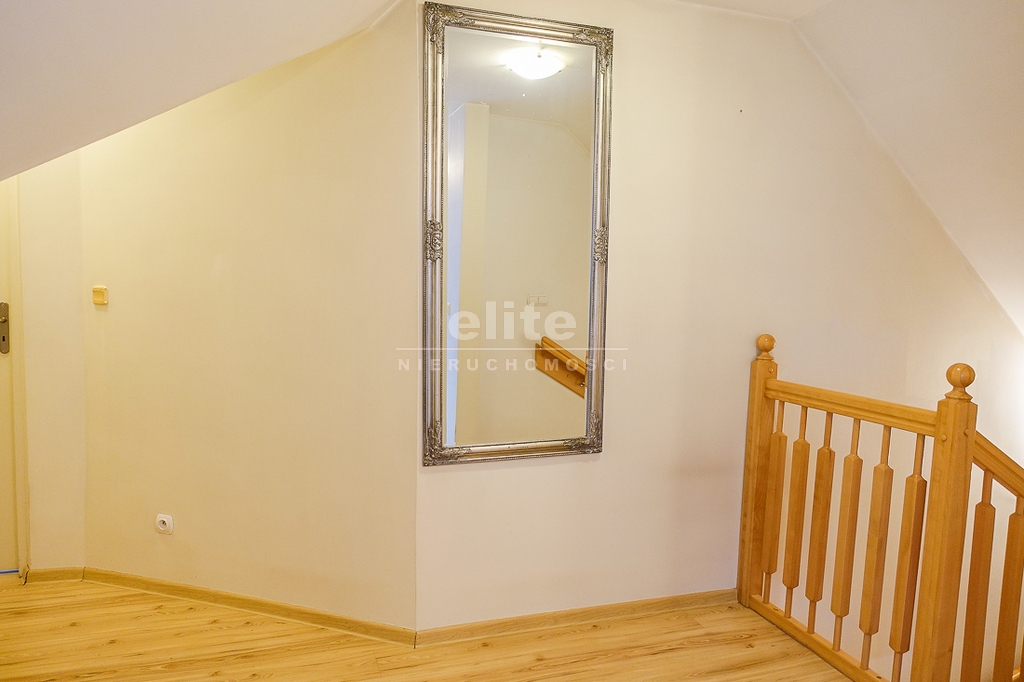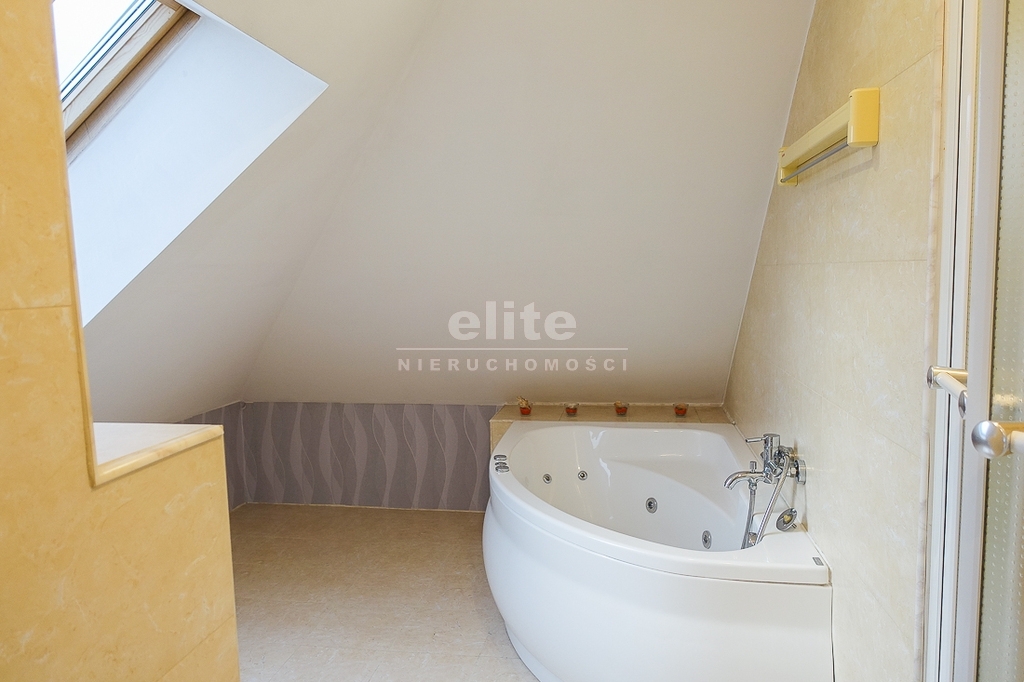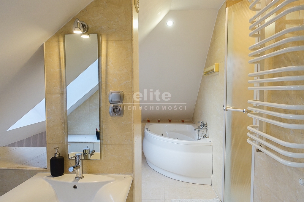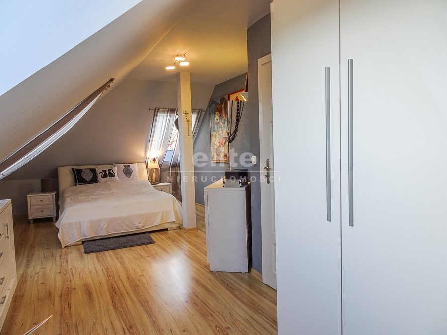 PIĘTRO ze skosami: pokój o powierzchni użytkowej 11,63 m2 po podłodze około 20 m2 i sypialnia po podłodze ok. 20 m2 z wejściem do garderoby, i pomieszczenie gospodarcze. Łazienka 4 m2 po podłodze ok. 10 m2 w niej wanna narożna, kabina prysznicowa, umywalka WC razem. W łazience okno, jasna glazura i terakota, średnie rachunki za energię elektryczną 600 zł.