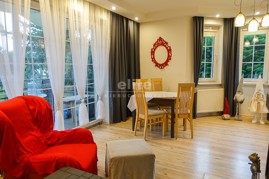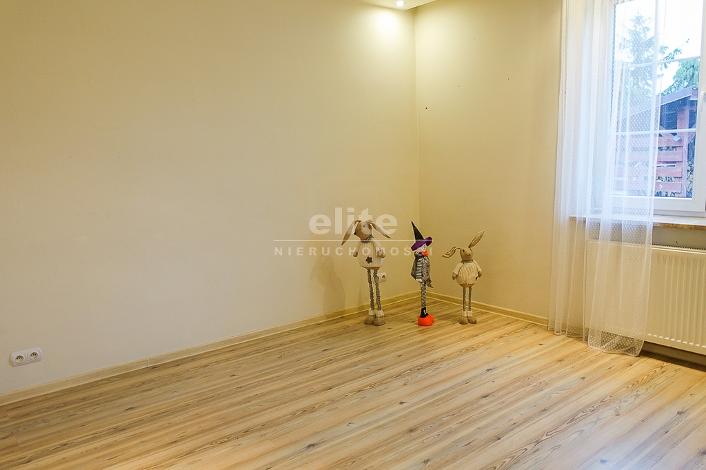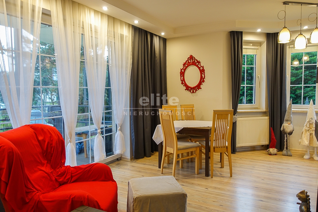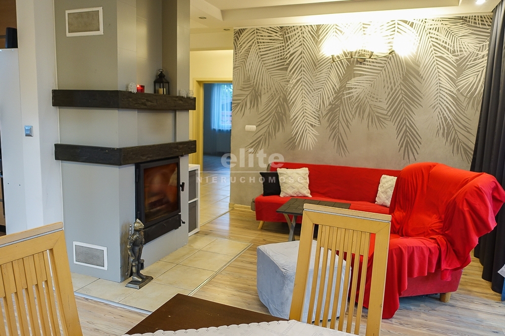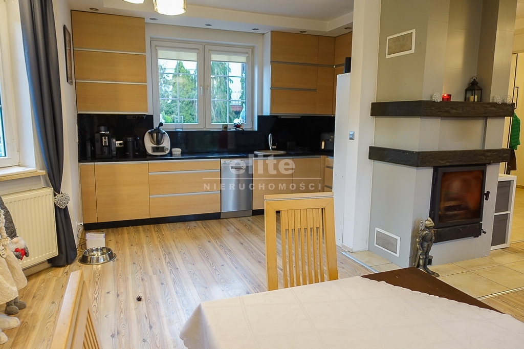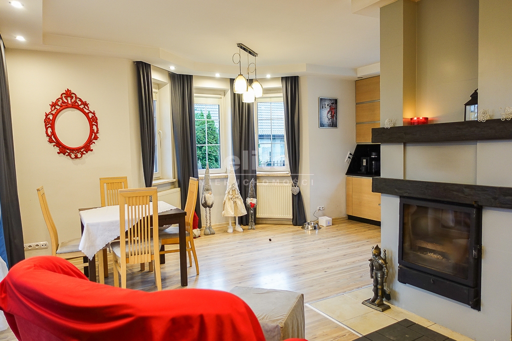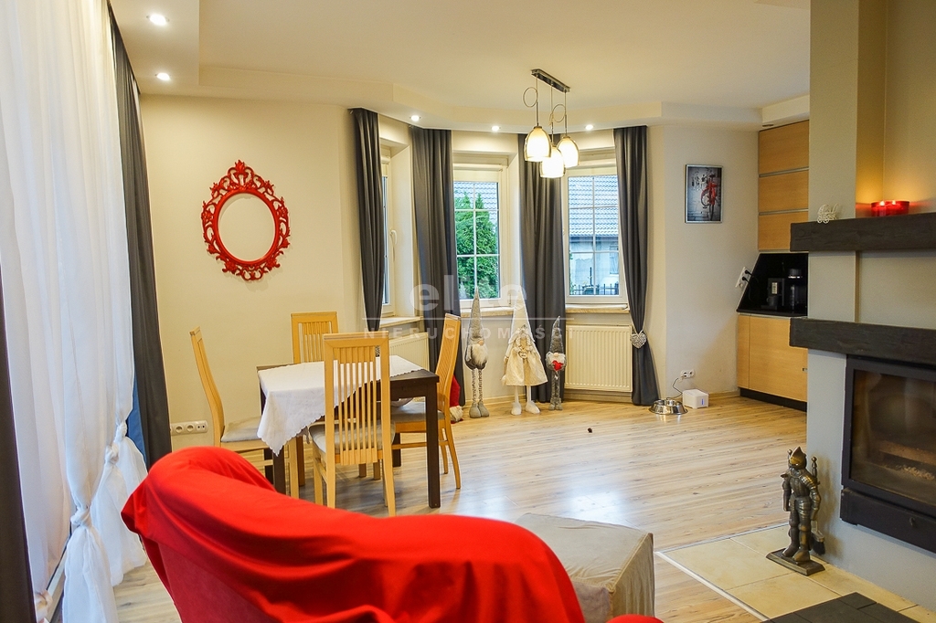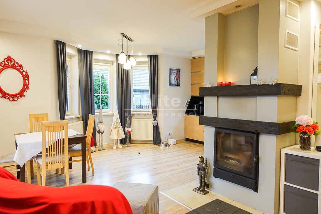 PARTER: salon 24 m2 z wyjściem na taras drewniany o pow. ok. 15 m2 i dalej do pięknie utrzymanego ogrodu z drzewami i krzewami oddzielającymi ogród od ulicy i sąsiednich budynków. Salon otwarty na aneks kuchenny o powierzchni 6 m2 z nowoczesną zabudową i urządzeniami AGD dodatkowo kominek z płaszczem wodnym. 2 pokoje 14,4 m2 i 15,3 m2. Hall 5,39 m2, łazienka 5,12 m2, klatka schodowa 5 m2, sień 3,69 m2. W łazience wanna i toaleta z umywalką. Ogrzewanie elektryczne i kominkowe.