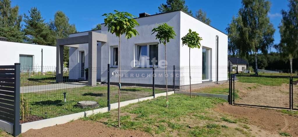 Nowy dom jednorodzinny, o nowoczesnej bryle, z płaskim dachem, wybudowany w 2024 roku, wg projektu indywidualnego.