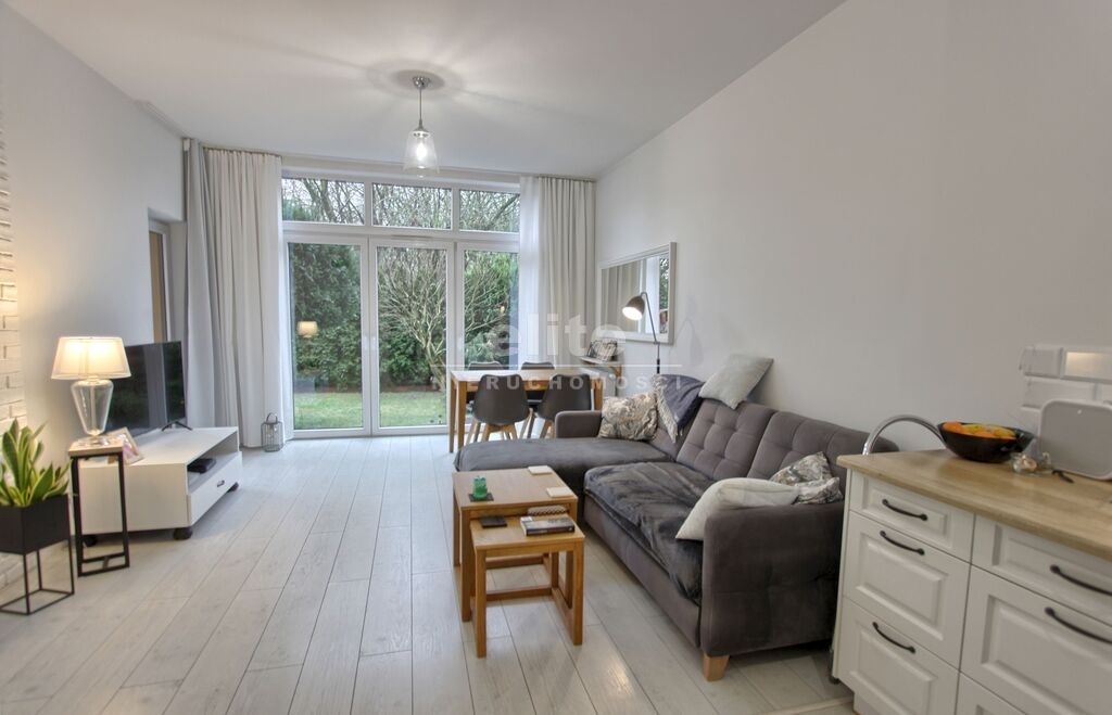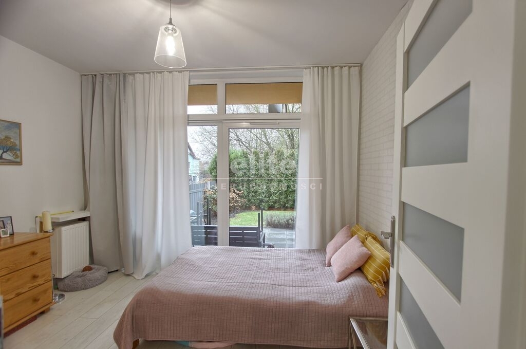 Mieszkanie bardzo doświetlone ze względu na nietypowe okna tarasowe, wyjście na ogródek zarówno z sypialni jak i salonu.