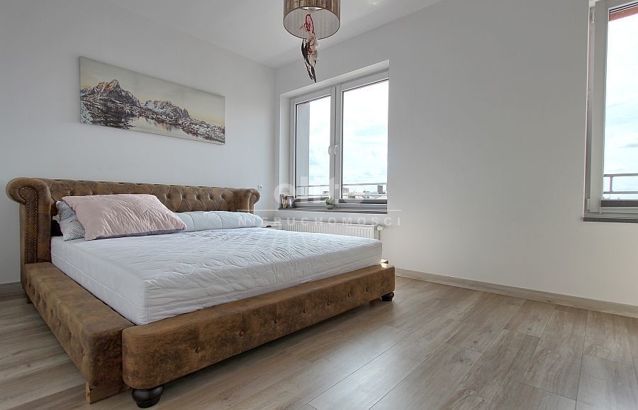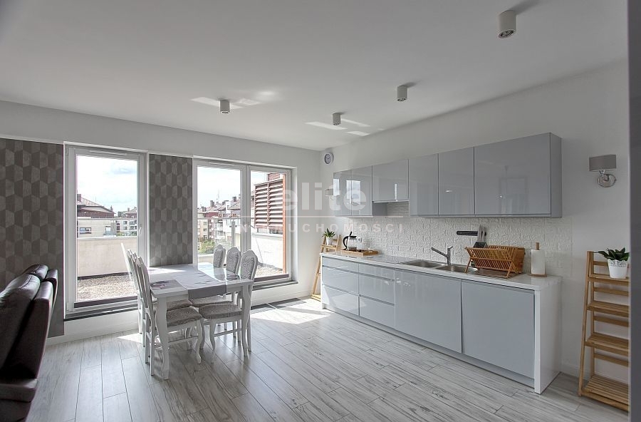 - Przestronny salon z otwartą kuchnią: Stylowo urządzony salon z bezpośrednim wyjściem na duży balkon oraz otwartą kuchnią, wyposażoną w nowoczesny sprzęt AGD.