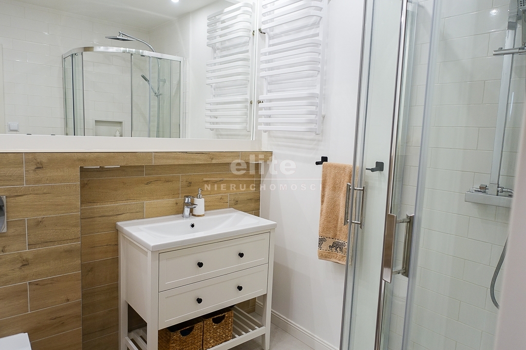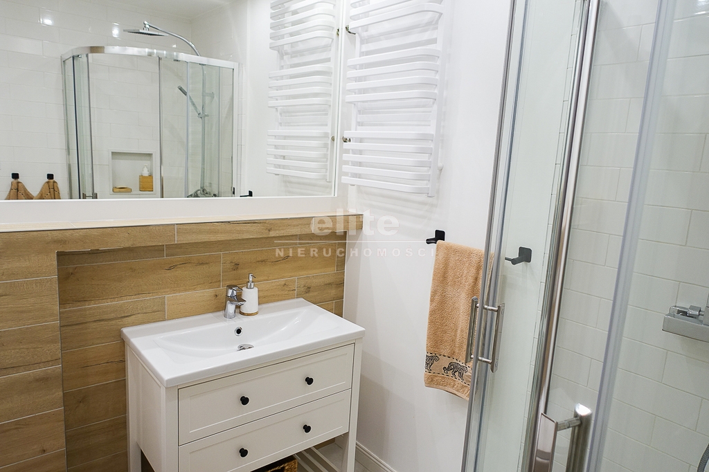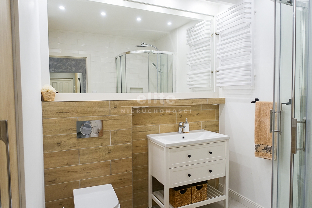 Łazienka po remoncie kapitalnym w niej kabina prysznicowa, WC z systemem GEBERIT, duże lustro, umywalka z szafką, ponadto zabudowa w niej pralka, półki na ręczniki, chemię gospodarczą itp. jest to miejsce, w którym może zainstalować suszarkę na pranie. Łazienka powstała z połączenia łazienki i WC o powierzchni po modernizacji 4,7 m2.