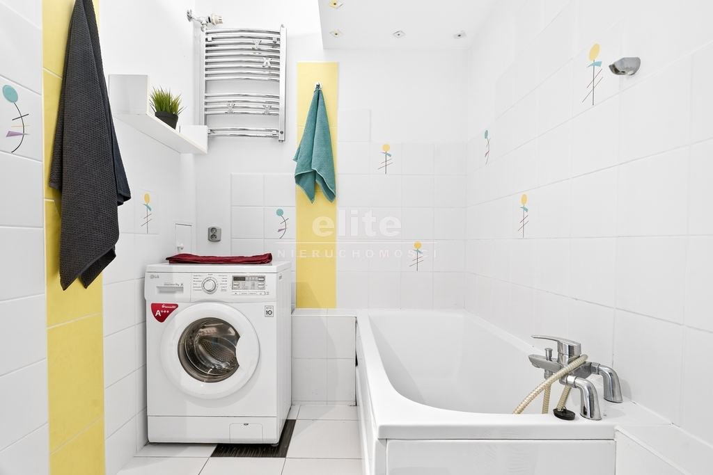 - Łazienka z wanną (ok. 5 m²) – wykończona glazurą i terakotą, z wanną i pralką