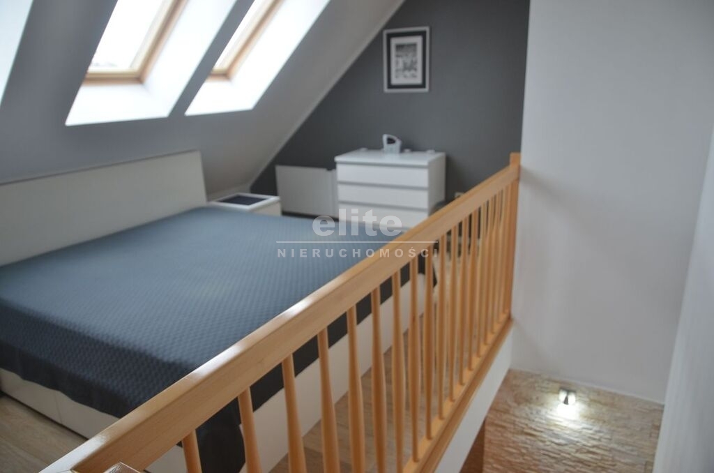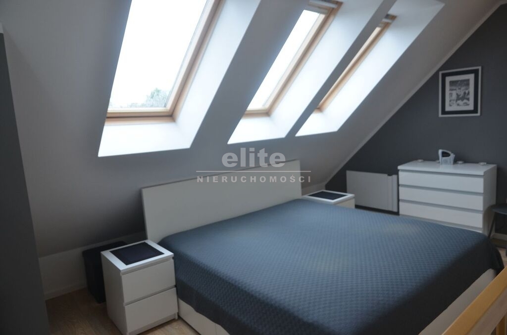 •Sypialnia (ok. 10 m²) z dużym łóżkiem oraz szafą. Na podłodze panele, okna połaciowe Velux (3-szybowe).