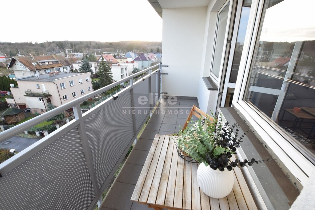 Widok z okien niską zabudowę sąsiednich nieruchomości oraz na Puszczę Bukową, w sąsiedztwie dużo zieleni.