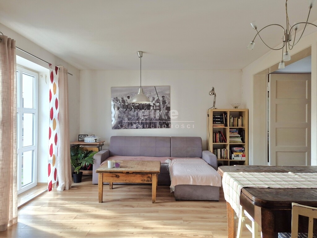 Przy obecnym układzie mamy klasyczny, duży przedpokój z którego wchodzi się do łazienki, kuchni, salonu i trzech sypialni, przy czym ta położona obok salonu jest przechodnia (piękne, duże, drewniane drzwi prowadzą do salonu). Jest wiele możliwości aranżacji pomieszczeń – w przykładowej wizualizacji wykorzystano koncepcję w której kuchnia zostaje przeniesiona właśnie do tej sypialni otwierając się na salon.