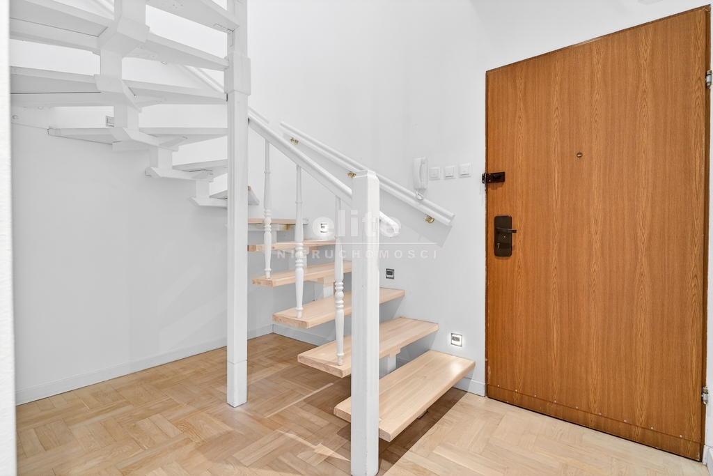 Wyposażenie, które pozostaje w mieszkaniu jest widoczne na zdjęciach. Mieszkanie po odświeżeniu i częściowym remoncie. Ciepłe, jasne i słoneczne. Na podłogach parkiet dębowy, odświeżony i wycyklinowany. Schody prowadzące na poziom - zakręcane, szerokie, bezpieczne i wygodne. W salonie znajduje się wypoczynek (kanapa z fotelami i stolikiem). Obie łazienki w pełni wyposażone, jedna z wanną, druga z prysznicem. W kuchni dębowe meble w zabudowie, piekarnik, mikrofala, płyta elektryczna, okap, zmywarka. W korytarzu dodatkowo obszerna szafa z lustrem typu garderoba. Na piętrze jedna sypialnia wyposażona w łóżko dwuosobowe z szafkami i dużą szafę z lustrem. Pozostałe dwie sypialnie do własnego doposażenia, według uznania i potrzeb najemców.