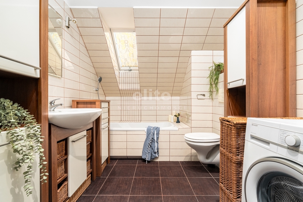 - Relaks w łazience: Przestronna łazienka z wygodną wanną oraz pralką.