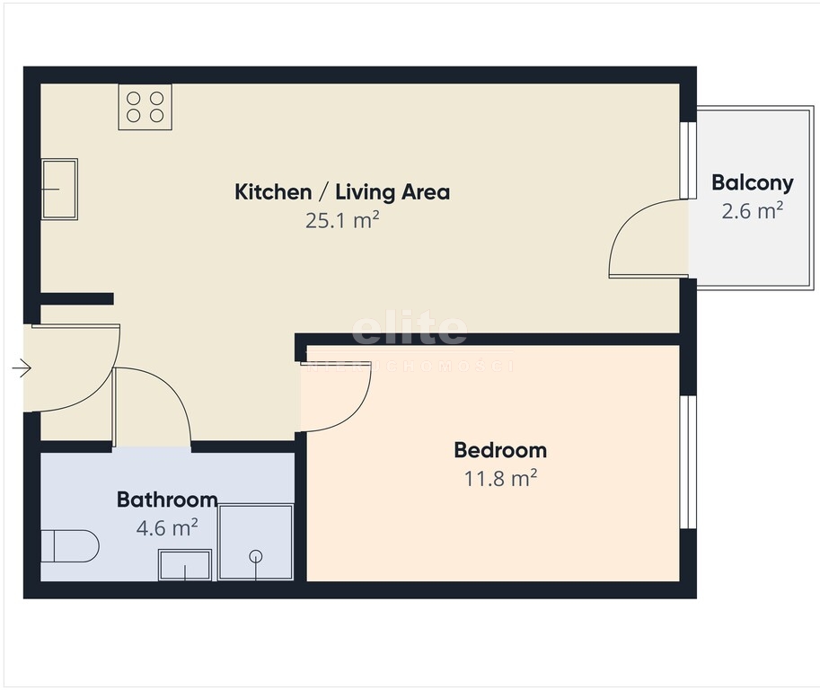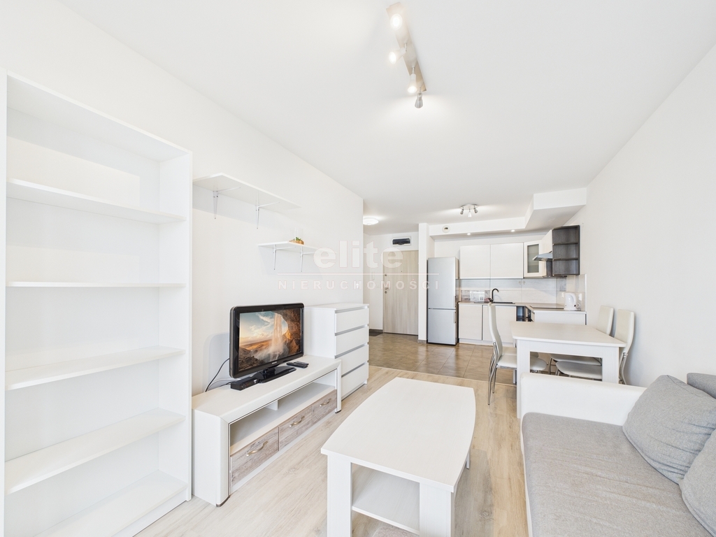 - salon z aneksem kuchennym i wyjściem na balkon -wyposażony w wypoczynek, stolik z krzesłami TV oraz zabudową mebli w kuchni wraz ze sprzętem AGD