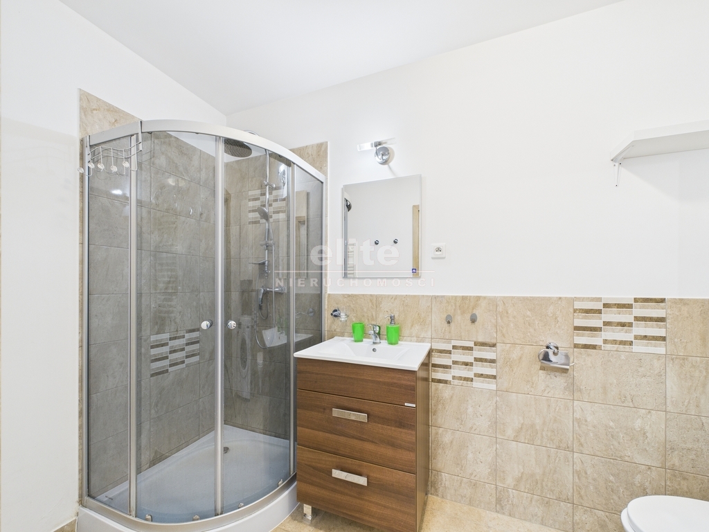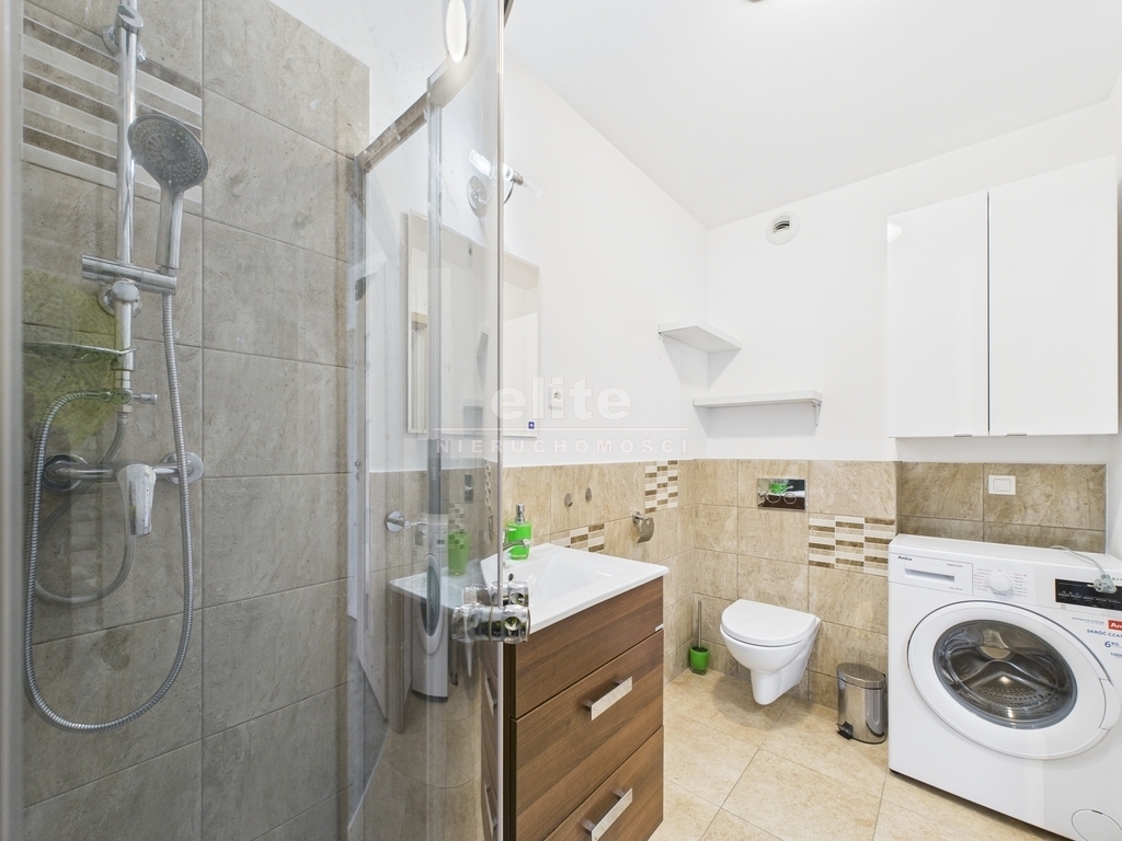 - łazienka z toaletą, kabiną prysznicową oraz pralką