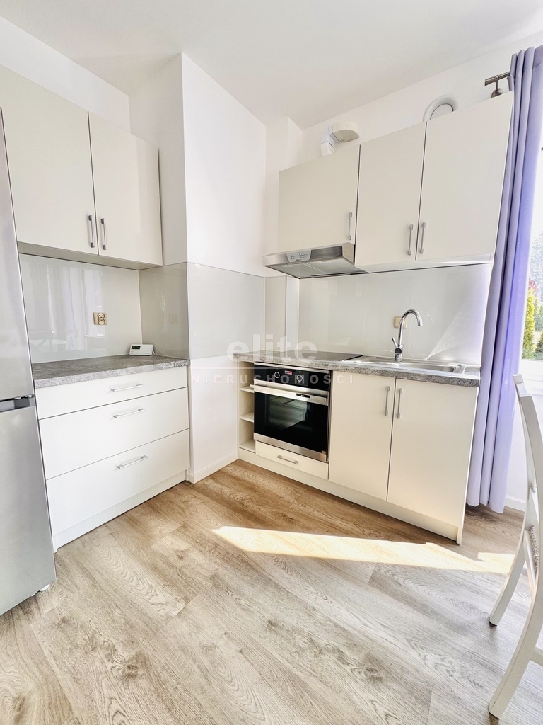 Mieszkanie składa się z dwóch, dużych pokoi (z wyjściem na zieloną przestrzeń), kuchni w aneksie, łazienki i korytarza.