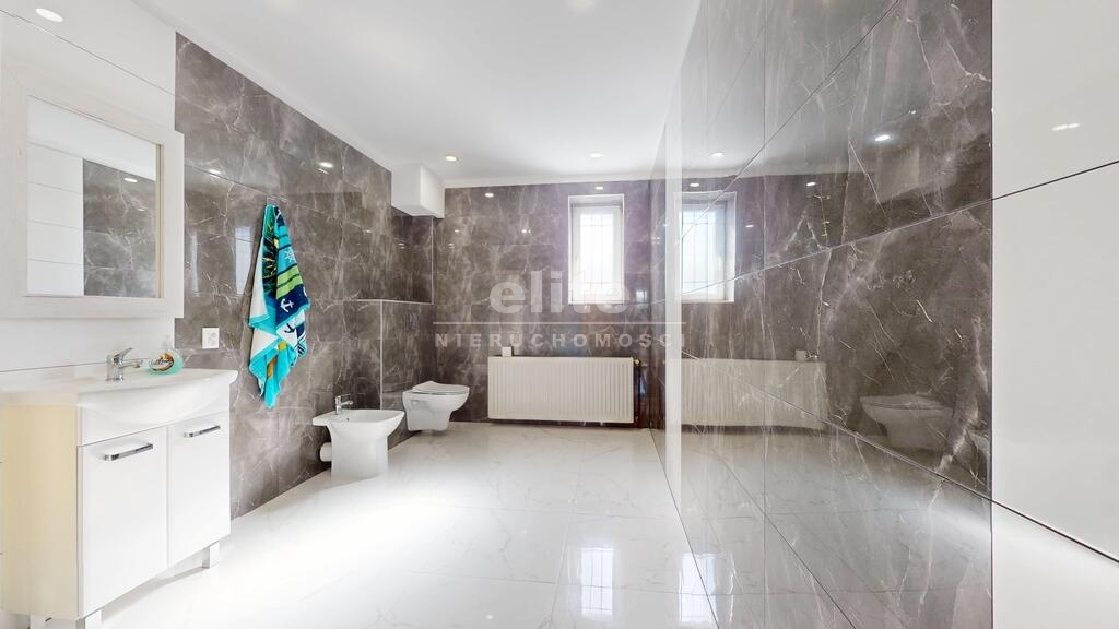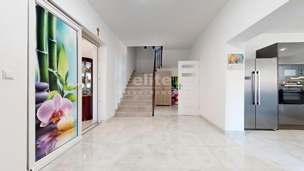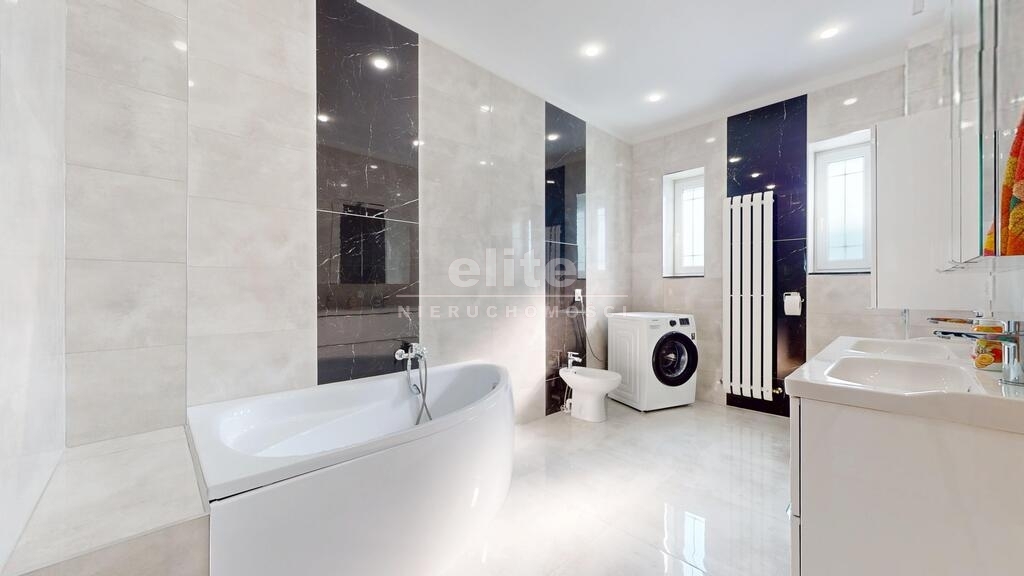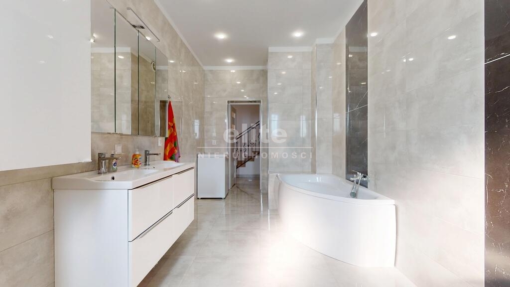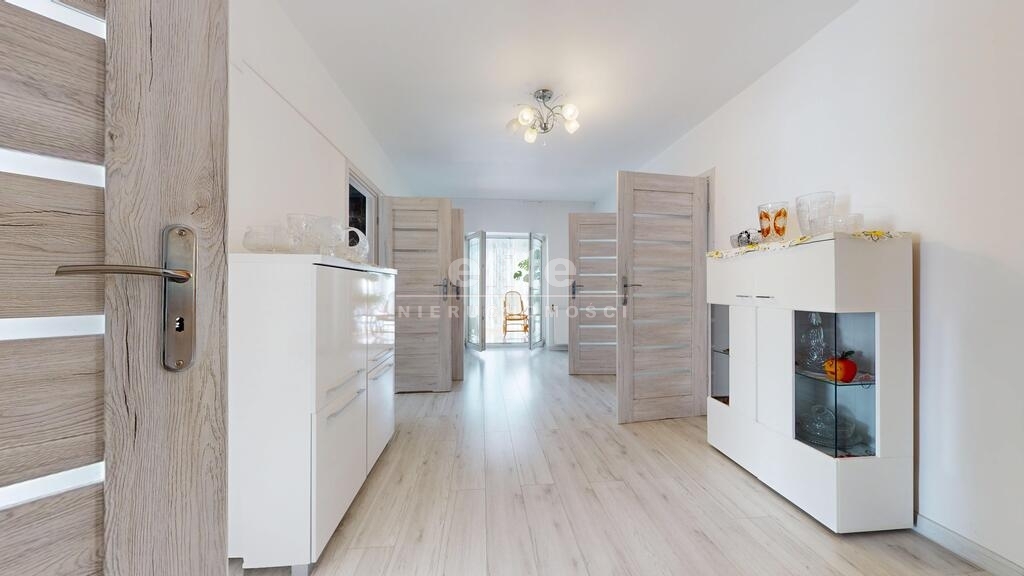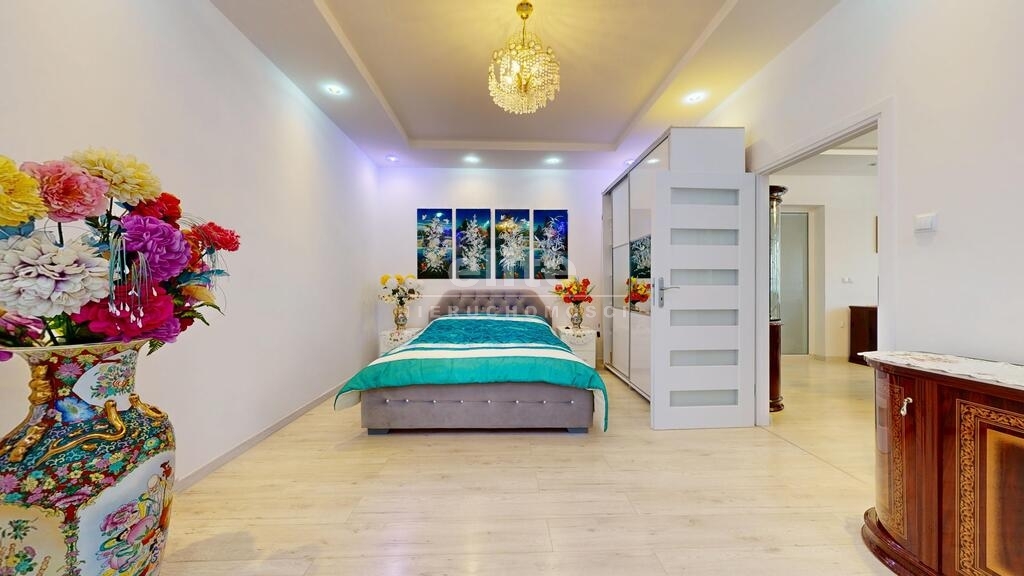 Wnętrze domu utrzymane w jasnych kolorach: biel i szarość. Kuchnia zabudowana meblami na wymiar ze sprzętem AGD. Na każdym piętrze duża łazienka: odpowiednio z wanną lub prysznicem. Na parterze oprócz salonu dodatkowy pokój, obecnie funkcjonujący jako sypialnia. Na piętrze cztery duże pokoje i duża garderoba. To tylko niektóre atuty nieruchomości.