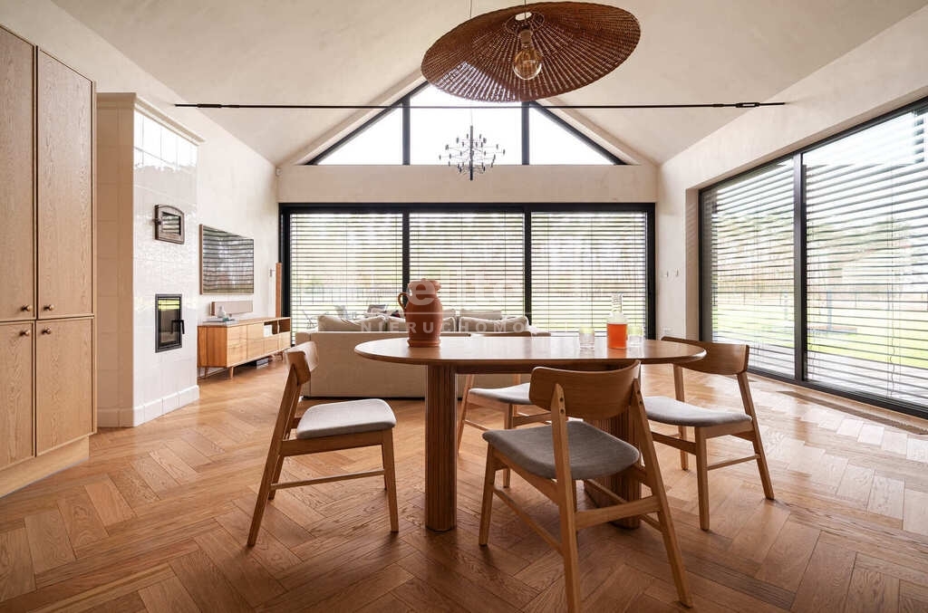 - Podłogi: W częściach mieszkalnych zastosowano elegancką lakierowaną deskę dębową.
