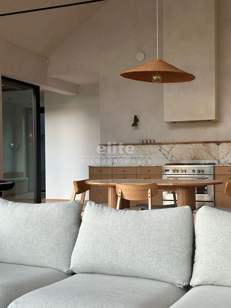 - Kuchnia i Jadalnia: Otwarta kuchnia z zabudową wykończoną naturalnym dębowym fornirem. Blaty, fartuch oraz dedykowane miejsce kawowe wykonano ze szlachetnego włoskiego marmuru Breccia Capraia.