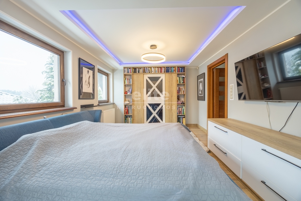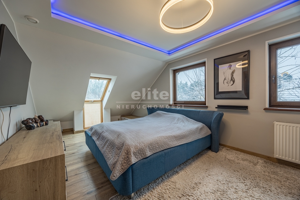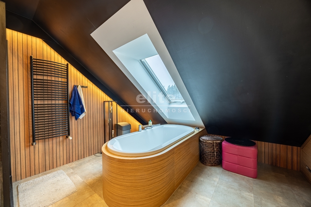Działka bardzo ładnie zagospodarowana, z licznymi nasadzeniami, systemem nawadniania oraz dużym zadaszonym tarasem. Na działce znajduje się także drugi garaż o powierzchni ok. 35 m2 z lekkiej konstrukcji, nieogrzewany.