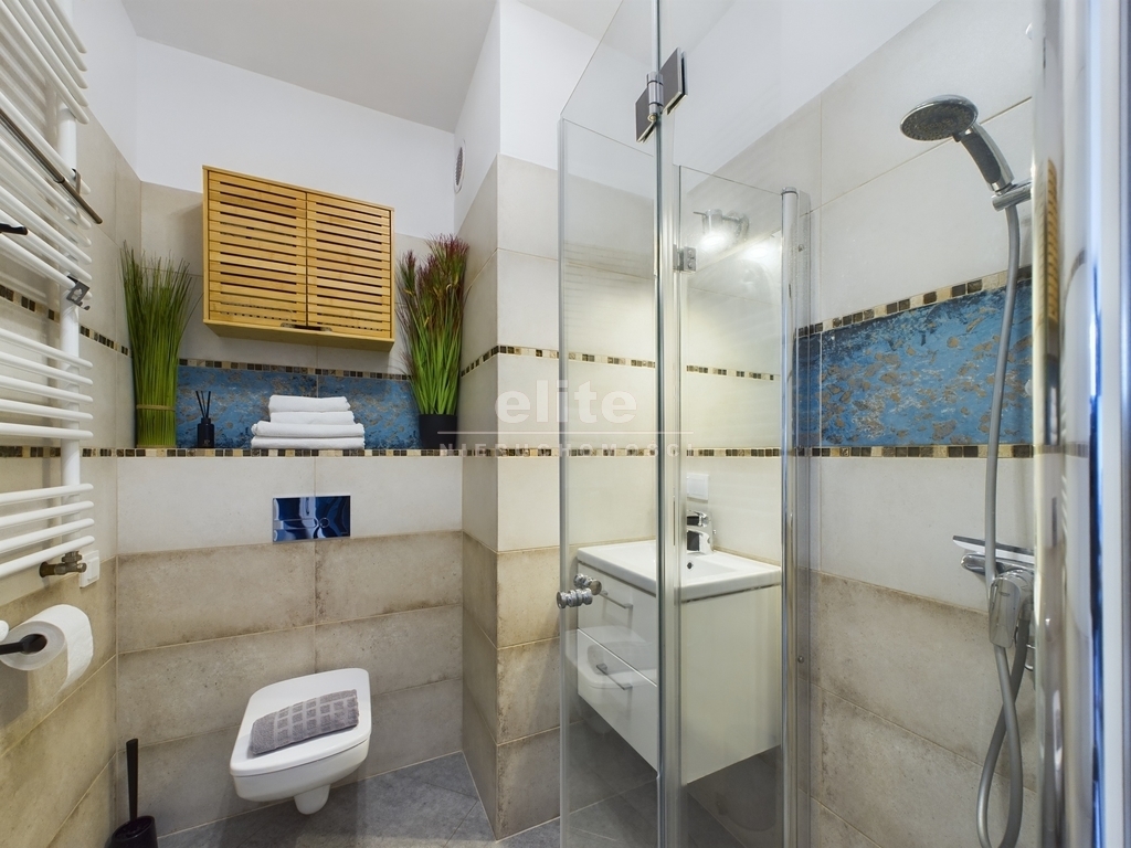 - Łazienka: Duża łazienka z nowoczesnym prysznicem, która zapewnia komfort i wygodę.
