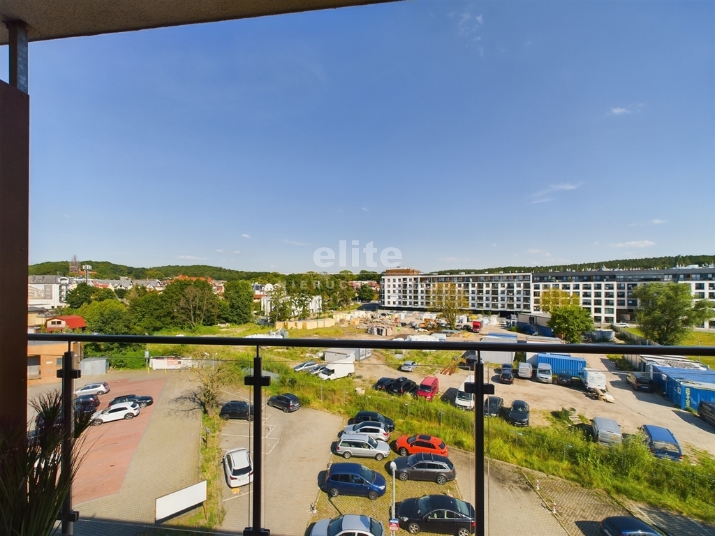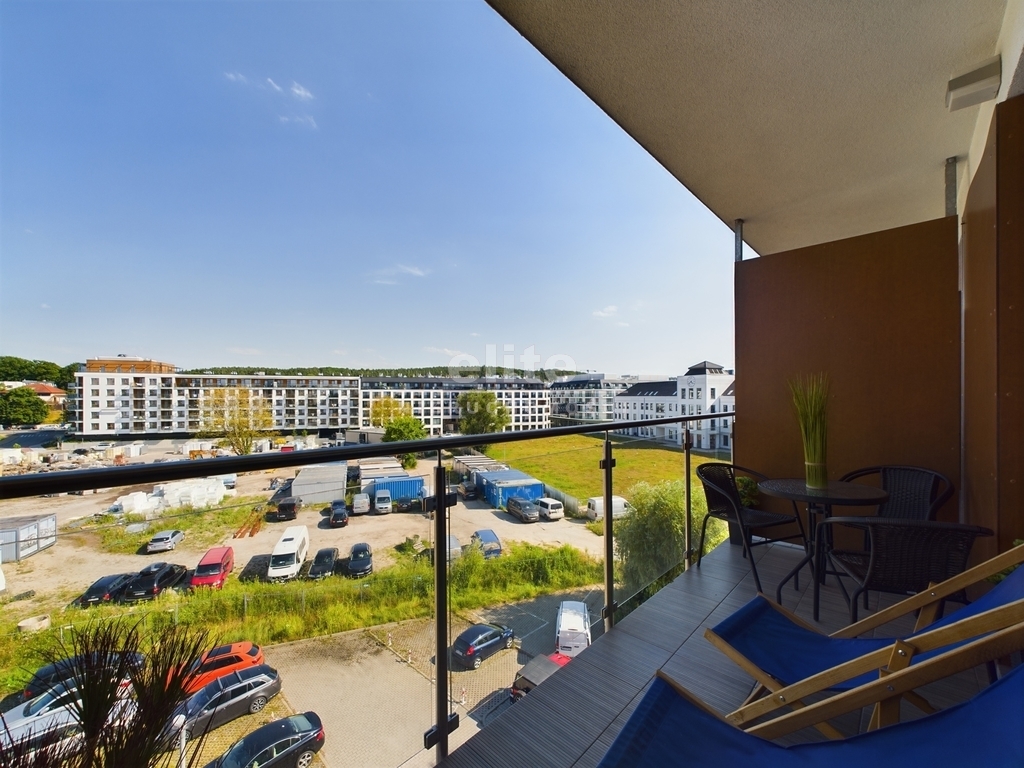 - Balkon tarasowy typu loggia: Przestronny balkon wyposażony w meble tarasowe oraz stolik. Oddzielona przestrzeń gwarantuje niezwykłą prywatność, umożliwiając relaks na świeżym powietrzu. Z balkonu rozpościera się przepiękny widok na ratusz, pobliski sklep Netto oraz w oddali zieleń drzew.