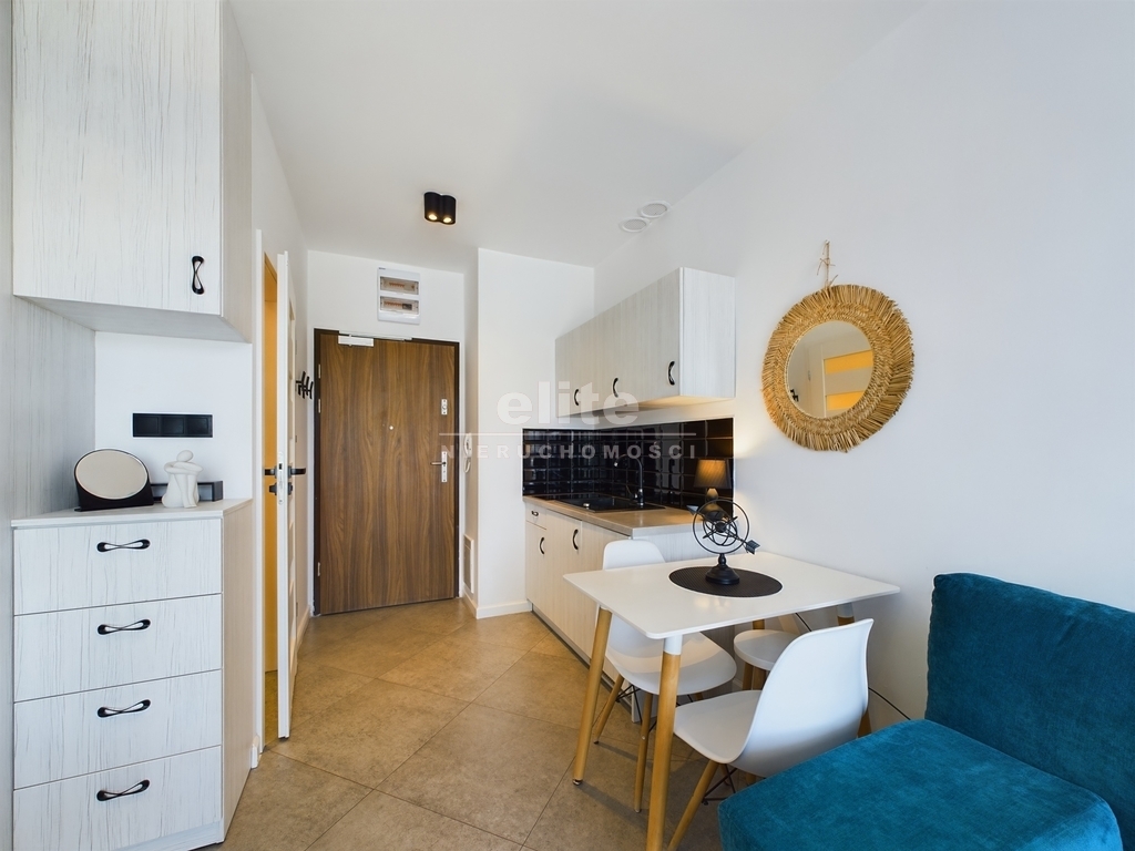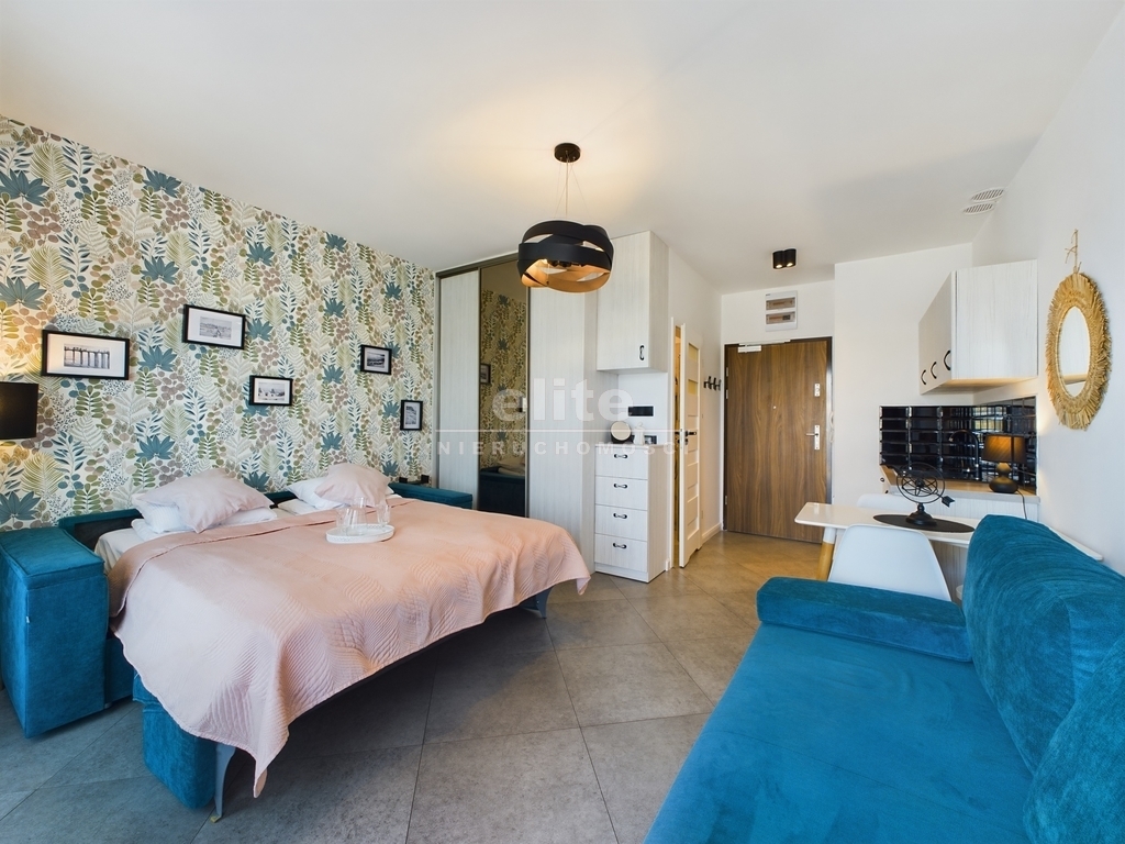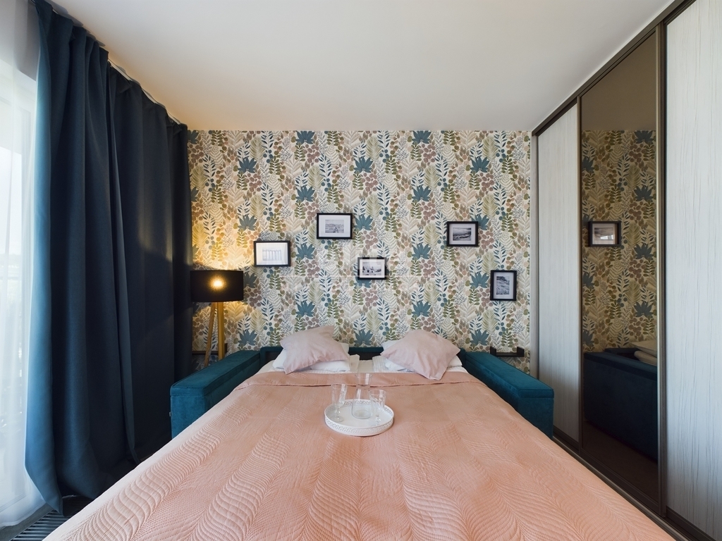 - Pokój: Przestronny, jasny pokój, który pełni funkcję sypialni i salonu. Znajduje się w nim wygodne łóżko sypialniane oraz rozkładana kanapa, co zapewnia komfortowy wypoczynek dla większej liczby osób. W pokoju wydzielona została również część jadalniana, idealna na rodzinne posiłki czy spotkania towarzyskie.