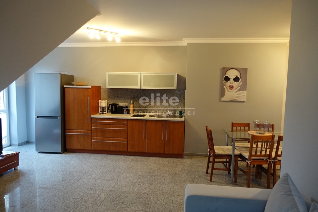 Apartament dwupoziomowy. Każdy poziom stanowi oddzielny apartament z oddzielnym wejściem z klatki schodowej, umeblowany i wyposażony w przedmioty niezbędne do codziennego użytku. W każdym z nich jest salon z aneksem kuchennym, sypialnia, łazienka i balkon. Idealny jako gotowy produkt inwestycyjny.