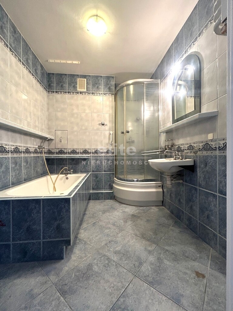 - łazienka z kabina prysznicową, wanną, umywalką i miejscem na pralkę